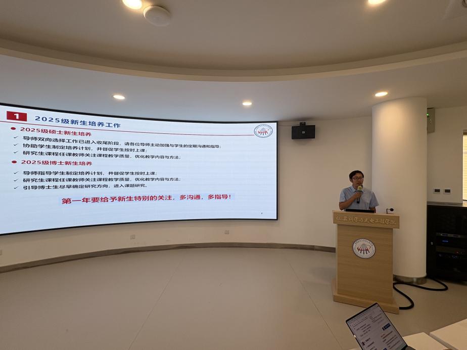 副院长王君系统汇报了本科教育教学工作。学院完成了2025版培养方案修订,强化了“AI+课程”建设,新增了《智能视觉工程》微专业,并深入开展了本研一体化课程体系建设,实现了本科与研究生课程的有效衔接。学院上半年学科竞赛成果丰硕,学生在世界机器人大赛、全国光电设计竞赛、RoboMaster机甲大师赛等重大赛事中摘金夺银,彰显了我院创新人才培养成效。