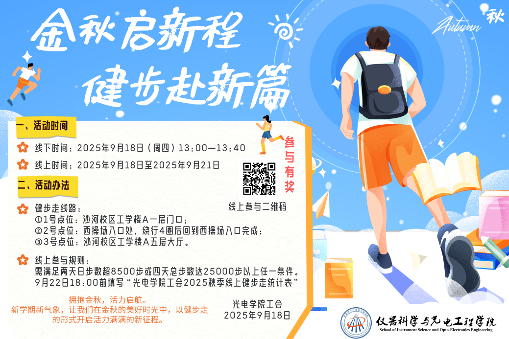 为倡导健康生活方式,增强教职工身体素质,展现学院教职工积极向上的精神风貌,2025年9月18日,光电学院在沙河校区工学楼A座一层组织开展教职工健步走活动启动仪式。本次活动以“金秋启新程·健步赴新篇”为主题,院党委书记、分工会主席姜伟华,党委副书记、院长周哲海与百余名教职工共同参与,用矫健的步伐展现昂扬向上的精神风貌。活动线上健步走环节将于9月21日结束。